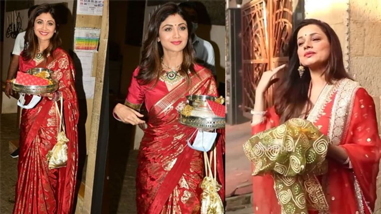 मांग में सिंदूर, लाल साड़ी और हाथ में पूजा की थाली लिए करवा चौथ मनाने अनिल कपूर के घर पहुंची शिल्पा शेट्टी