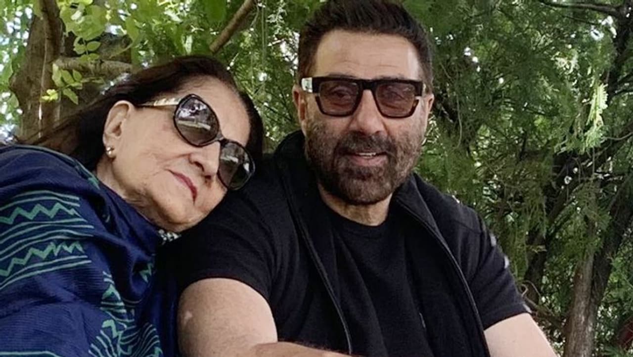 - चेहरे पर मुस्कान और गॉगल लगाए 63 साल के बेटे के कंधे पर सिर टिकाए आराम करती दिखी सनी देओल की मां