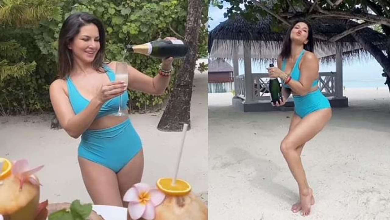 नीली बिकिनी और हाथ में शैम्पेन की बोतल लिए मस्ती करती नजर आई सनी लियोनी, समुंदर किनारे लगाए ठुमके भी
