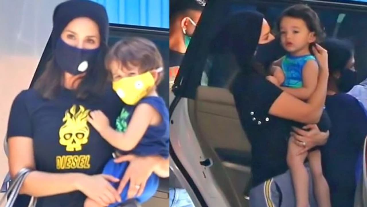 एक बेटे को मास्क पहनाए तो दूसरे को बिना मास्क के ही घुमाती रहीं सनी लियोनी।