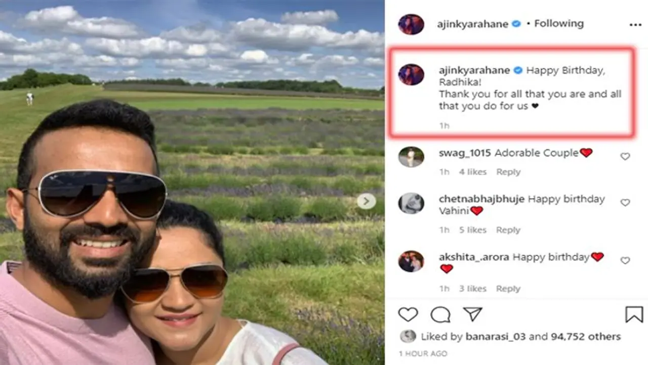 राधिका धोपावकर और अजिंक्य रहाणे की पत्नी 11 अप्रैल को अपना जन्मदिन मना रही हैं। अपनी वाइफ के बर्थडे पर अजिंक्य रहाणे ने सोशल मीडिया पर राधिका के साथ कुछ फोटोज शेयर की और लिखा कि, 'जन्मदिन मुबारक हो, राधिका। आपका धन्यवाद और आप हमारे लिए जो कुछ भी करते हैं उसके लिए।'