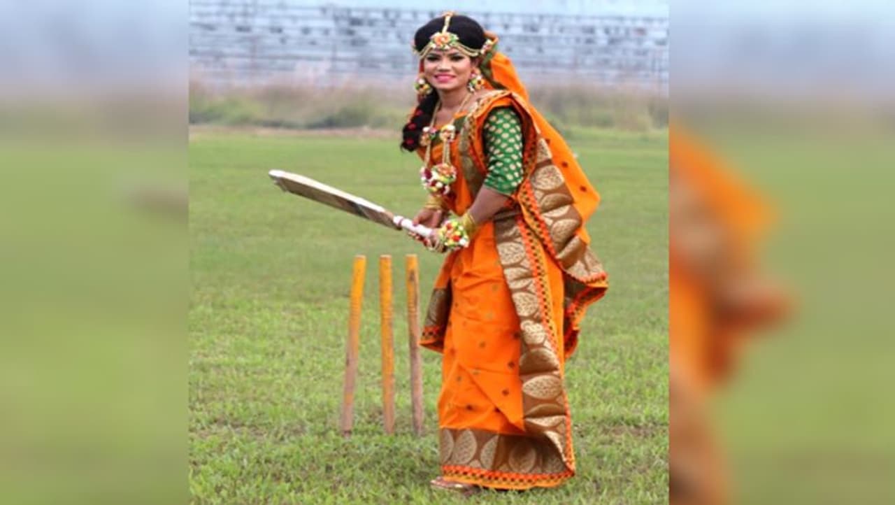 नारंगी रंग की साड़ी, मांग टीका, हाथों में चूड़ी और फूलों से बनी ज्वैलरी पहनकर आपने पहले शायद किसी दुल्हन को क्रिकेट मैदान पर नहीं देखा होगा। ये है बांग्लादेश की 24 साल की महिला क्रिकेटर संजीदा इस्लाम।