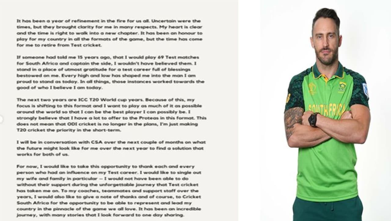 बुधवार 17 फरवरी को साउथ अफ्रीका के धुआंधार बल्लेबाज फाफ डु प्लेसिस ने अपने संन्यास की खबर से सबको हैरान कर दिया। राइट हैंड के इस बल्लेबाज ने टेस्ट क्रिकेट से रिटायर होने का फैसला कर लिया है।
