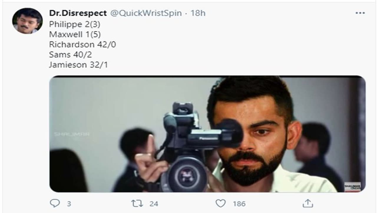 बता दें कि सोशल मीडिया पर भी उनको खूब ट्रोल किया जा रहा है। एक यूजर ने ये फोटो शेयर कर लिखा कि, मैक्सवेल की परफॉर्मेंस देखने के बाद विराट कोहली- ओए चूना लगा दिया।