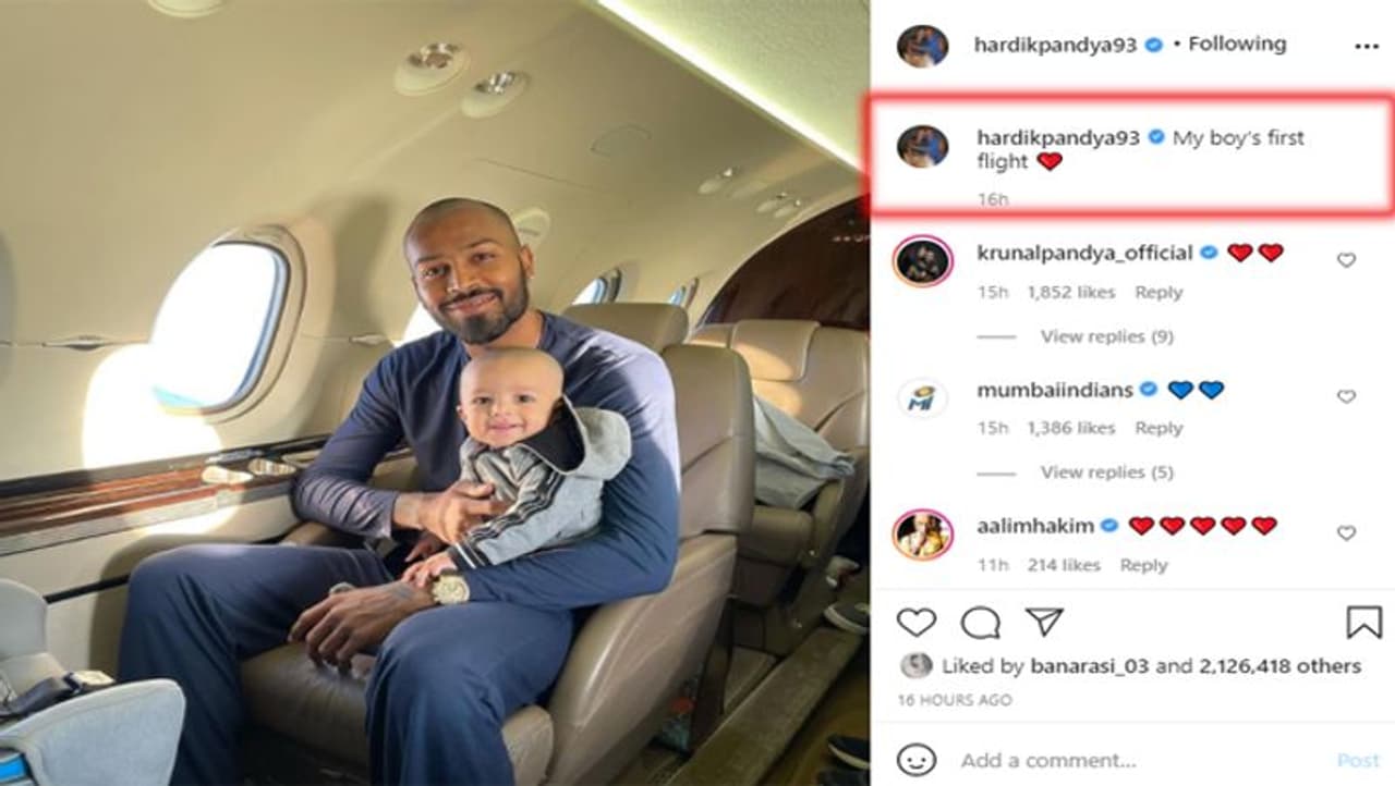 क्रिकेटर हार्दिक पंड्या और एक्ट्रेस नताशा स्टानकोविच के बेटे ने पहली बार प्लेन में सफर किया। जिसकी तस्वीर नताशा और हार्दिक पंड्या ने अपने इंस्टाग्राम अकाउंट पर शेयर की है। फोटो को शेयर करते हुए पंड्या ने कैप्शन में लिखा है, 'मेरे बेटे की पहली फ्लाइट।'