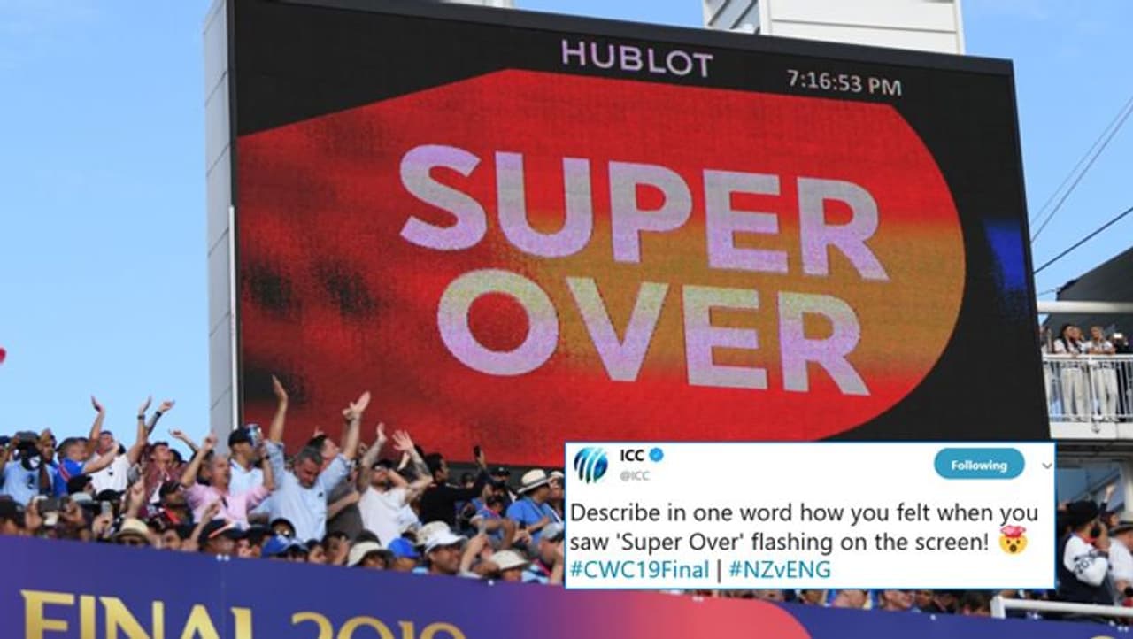 आईसीसी ने लिखते हुए क्रिकेट फैन्स से पूछा- एक शब्द में बताएं कि जब आपने स्क्रीन पर 'सुपर ओवर' फ्लैश होते देखा तो आपको कैसा लगा!