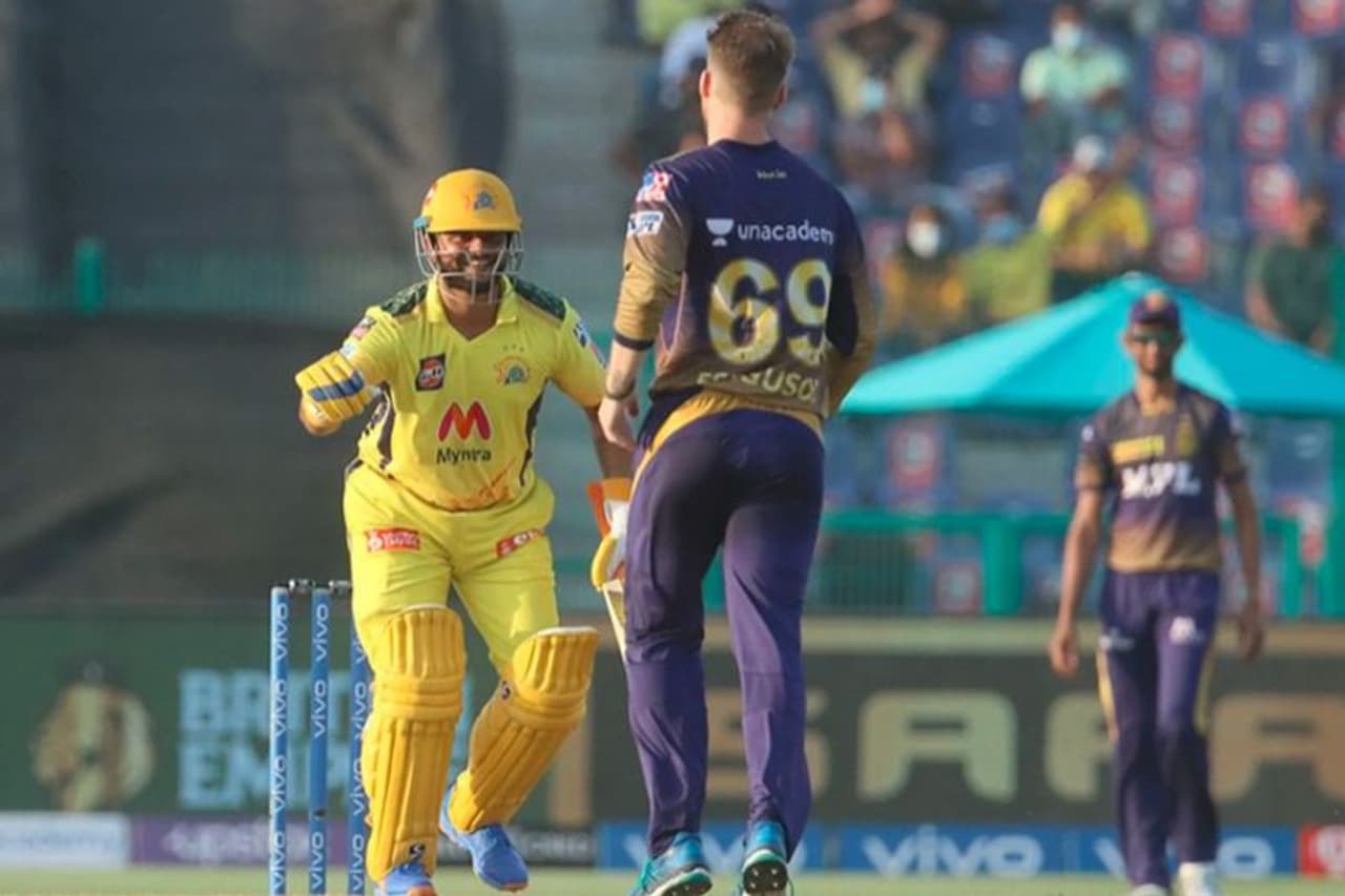 मैच के आखिरी ओवरों में रवीन्द्र जडे़जा ने शानदार खेल दिखाया। उन्होंने अपनी पारी में 8 गेंदों में 22 रनों की पारी खेली। प्रसिद्ध कृष्णा की बॉल पर सिक्स लगाते जड़ेजा।