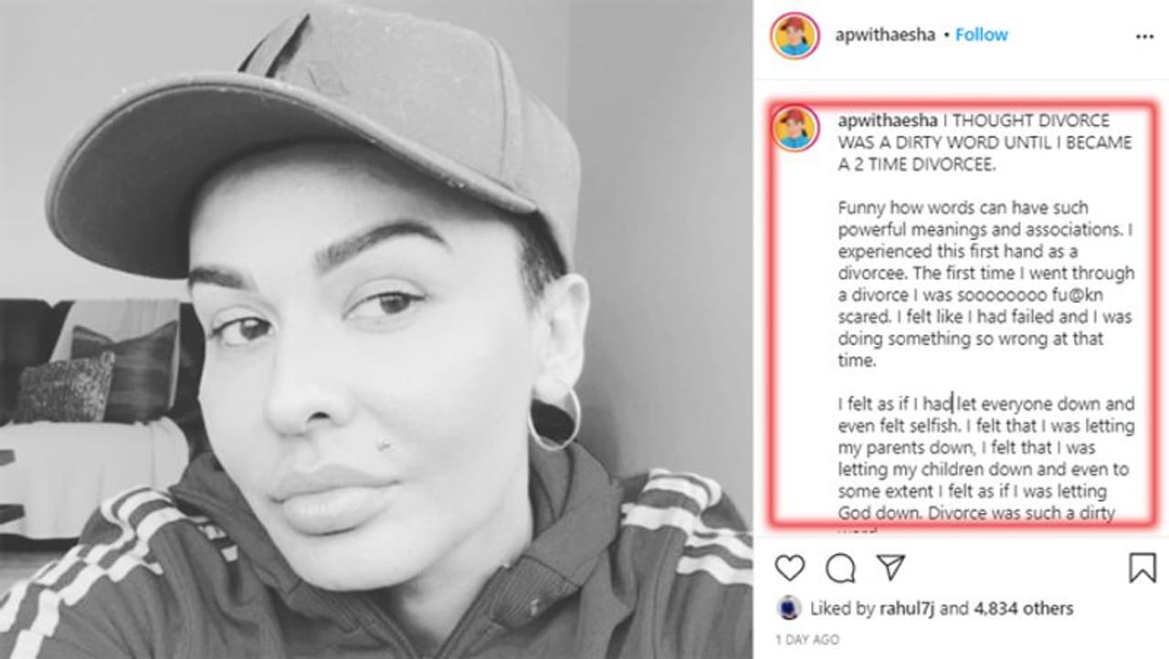 इंस्टाग्राम पर शेयर की गई इस लंबी-चौड़ी पोस्ट में आयशा ने अपनी पहले तलाक और दूसरे तलाक के एक्सपीरियंस के बारे में लिखा और इसका मतलब भी बताया। उन्होंने कहा कि'पहली बार जब मेरा तलाक हुआ तब मैं काफी ज्यादा डरी हुई थी। मुझे लगा जैसे मैं नाकाम हो गई हूं और मैं उस समय काफी गलत कर रही थी। मुझे लगा जैसे मैंने सबको नीचा दिखाया है और स्वार्थी जैसा भी लगा। मुझे लगा कि मैं अपने माता-पिता को निराश कर रही हूं। मुझे लगा कि मैं अपने बच्चों को नीचा दिखा रही हूं और कुछ हद तक मुझे लगा कि मैंने भगवान का भी अपमान किया। एक बार तलाक लेने के बाद दूसरी बार लगा कि मेरा काफी कुछ दांव पर था। मुझे काफी कुछ साबित करना था। इसलिए जब मेरी दूसरी शादी टूटी तो यह काफी बुरा था। पहली बार मैं जिन भावनाओं से गुजरी थीं वह फिर से लौट आईं। सौ गुना डर, नाकामी और निराशा। इसका क्या मतलब है?'