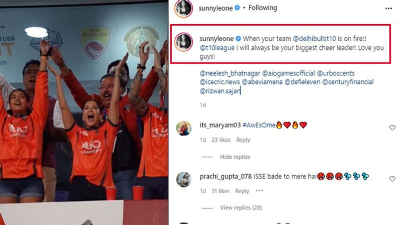 बॉलीवुड एक्ट्रेस सनी लियोन शनिवार को अपने ऑफिशल इंस्टाग्राम पर एक वीडियो शेयर किया। जिसमें वह आबुधाबी में अपनी टीम दिल्ली बुल्स को सपोर्ट करती नजर आ रही है। इस वीडियो को शेयर कर उन्होंने लिखा- 'जब आपकी टीम दिल्ली बुल्स टी10 लीग में आग लगा रही हो, तो मैं आपकी सबसे बड़ी चीयर लीडर रहूंगी। मैं आप लोगों को बहुत प्यार करती हूं।'