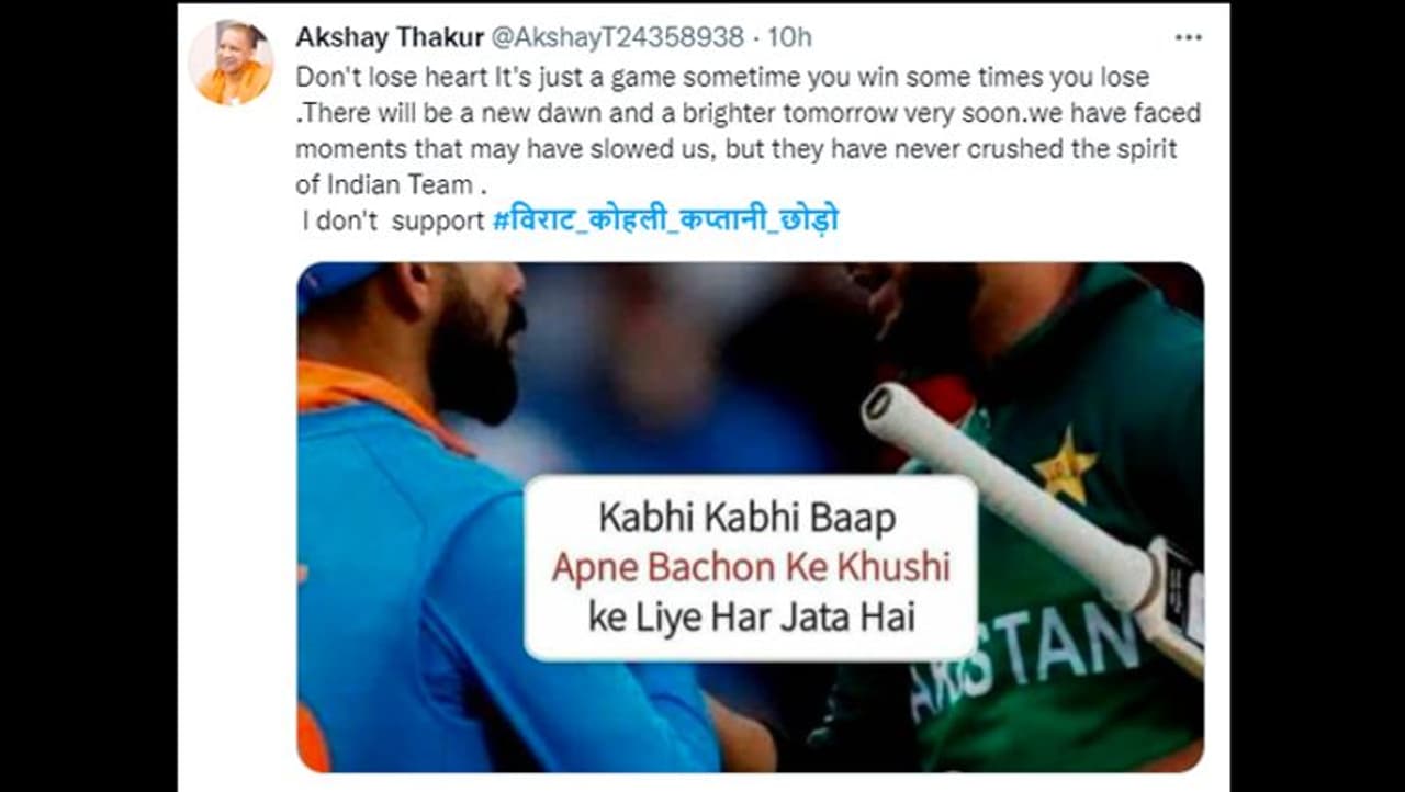 ट्विटर पर कई लोगों ने विराट कोहली को हार का जिम्मेदार ठहराया, लेकिन कुछ ने कहा कि खराब ओपनिंग और बॉलिंग की वजह से टीम इंडिया की हार हुई। विराट ने तो अच्छी पारी खेली। उनकी हार में कोई गलती नहीं है।