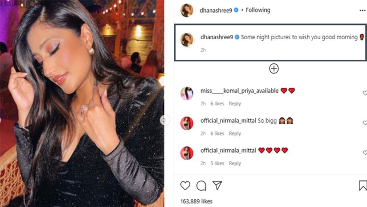 शुक्रवार को युजवेंद्र चहल की पत्नी धनाश्री वर्मा ने इंस्टाग्राम पर अपनी कुछ तस्वीरें शेयर की और लिखा- 'गुड मॉर्निंग विश करने के लिए रात की कुछ तस्वीरें...'
