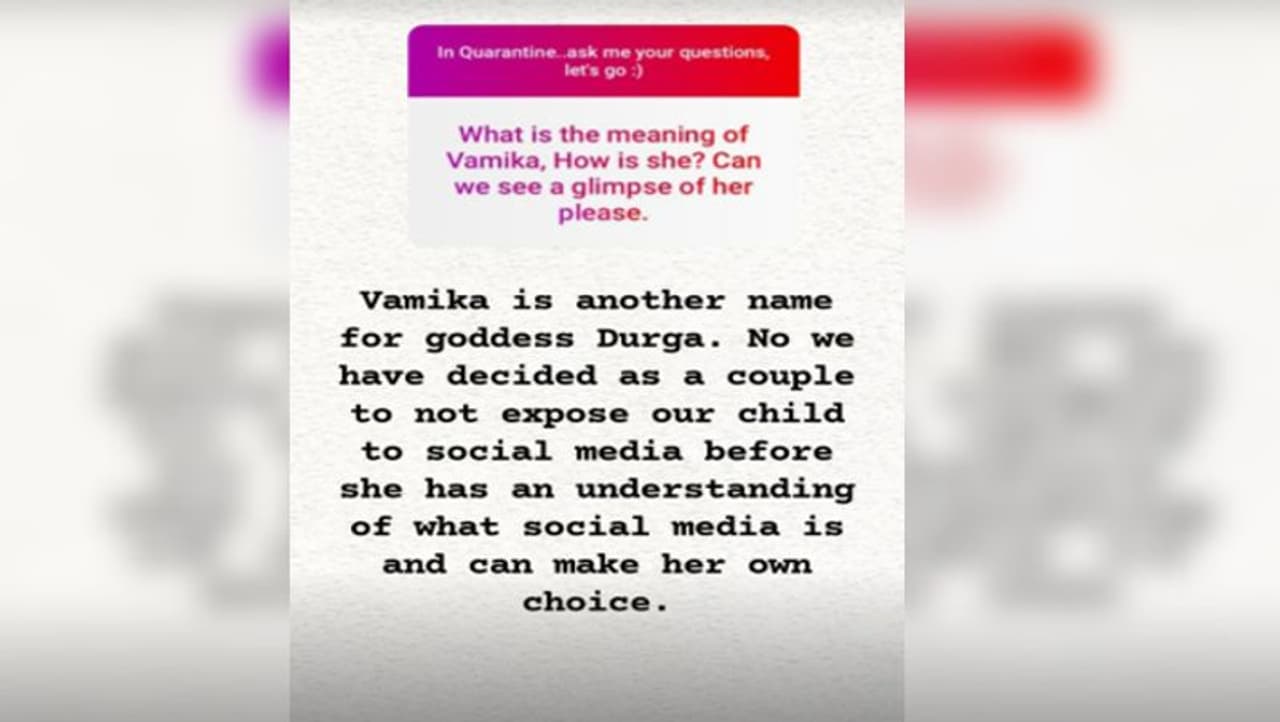 एक फैन ने कोहली से पूछा कि वामिका का मतलब क्या है ? वह कैसी है ? क्या हम उसकी झलक देख सकते हैं ? जिसके जवाब में उन्होंने कहा कि, वामिका मां दुर्गा का दूसरा नाम हैं। नहीं, हमने एक कपल के रूप में अपने बच्चे को सोशल मीडिया पर उजागर नहीं करने का फैसला किया है, इससे पहले कि उसे सोशल मीडिया की समझ हो और ये उसकी च्वाइस हो सकें।