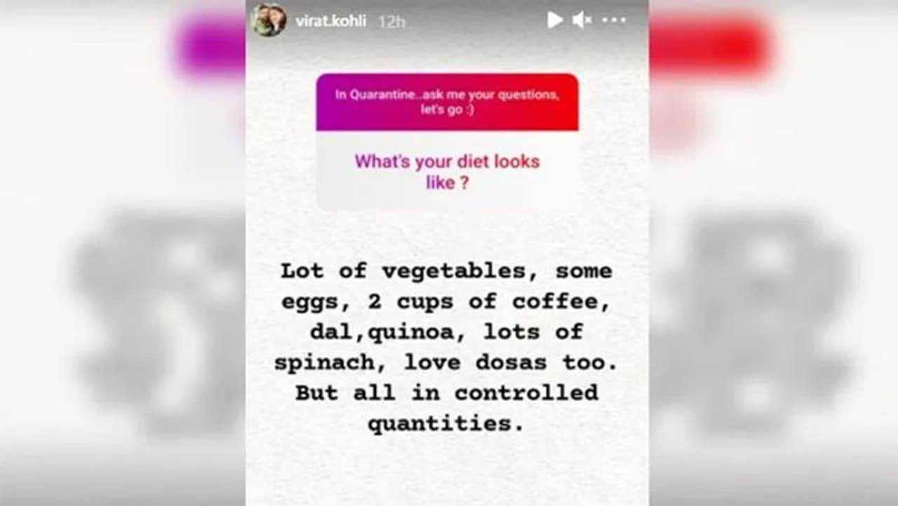 हाल ही में विराट की डाइट को लेकर एक फैन ने सवाल पूछा, तो उन्होंने बताया कि, 'मुझे बहुत सारी सब्जियां, कुछ अंडे , 2 कप कॉफी, दाल, क्विन्वा, पालक और डोसा पसंद हैं लेकिन सभी सीमित मात्रा में।'