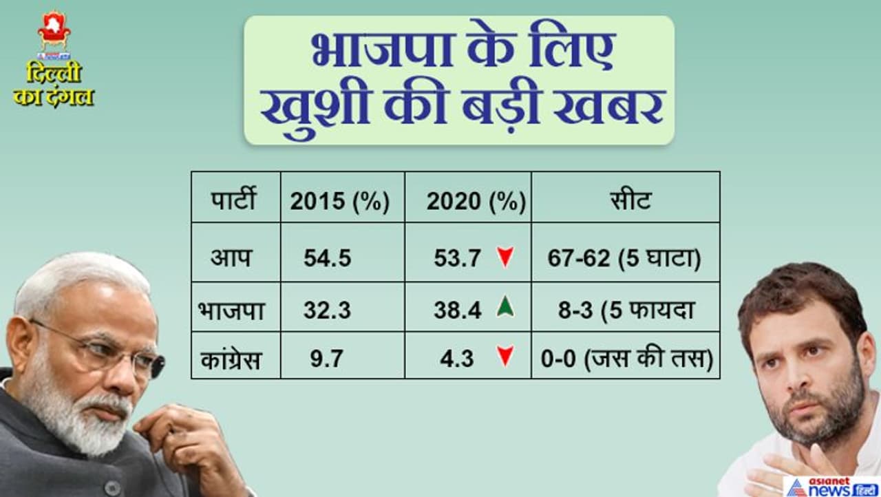वोट प्रतिशत के साथ भाजपा को सीटों का फायदा : इस बार के विधानसभा चुनाव में भाजपा के वोट प्रतिशत में 6.1प्रतिशत वोट बढ़े हैं। वहीं सीटों की संख्या भी 3 से बढ़कर 8 हो गई है। आप के वोट प्रतिशत में 0.8 प्रतिशत का घाटा हुआ है। सीटों की संख्या भी 67 से घटकर 62 पर आ गई है। कांग्रेस की सीट जीरो की जीरो बनी हुई है, लेकिन वोटों की संख्या में आधी कमी आ गई है। कांग्रेस का वोट 5.4 प्रतिशत कम हुआ है।
