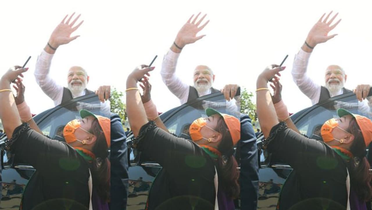 मोदी ने अपनी फ्लीट रुकवाई और बाहर निकलकर लोगों का अभिनंदन किया। पीएम को सामने देखकर एक महिला कार्यकर्ता कार के पहुंच गई।