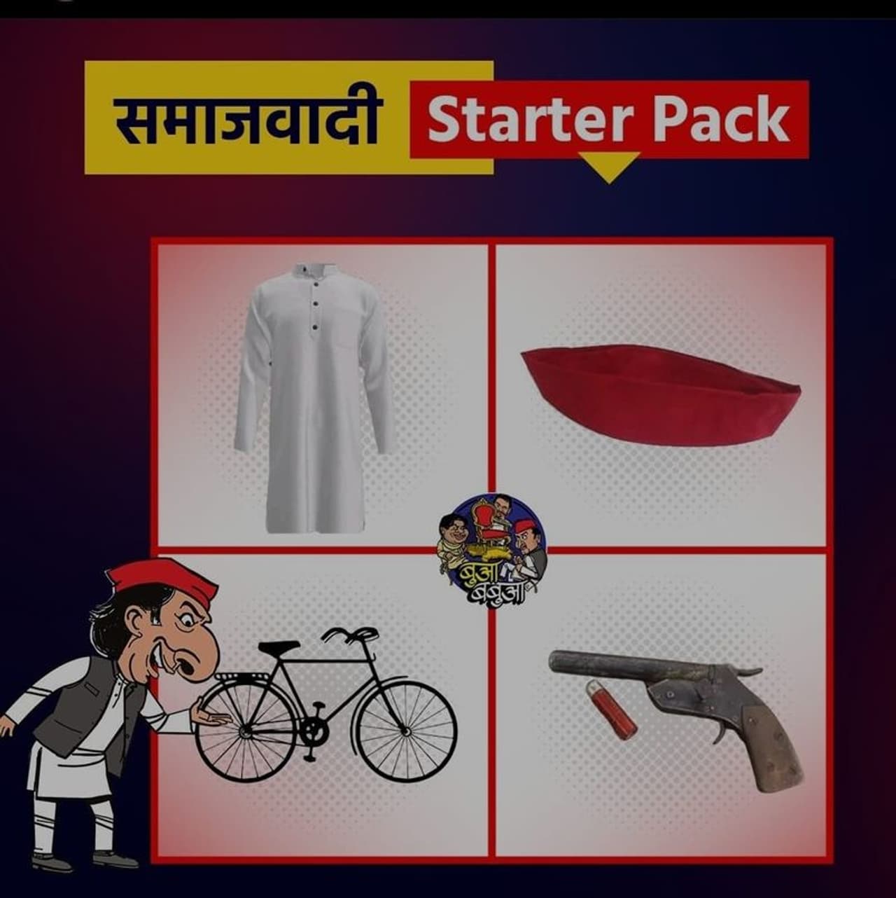 यहां पर कोई सोशल मीडिया यूजर ने समाजवादी पार्टी जॉइन करने के लिए स्टार्टर पैक बताया है। जिसमें एक कुर्ता, एक लाल टोपी, एक साइकिल और एक तमंचा को दिखाया है।