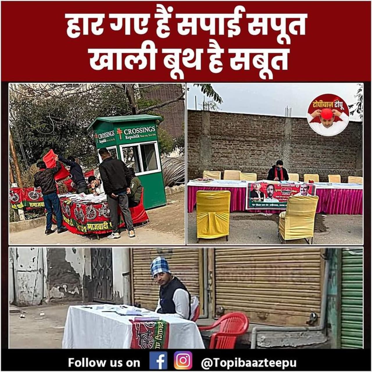 इस फोटो को ध्यान से देखिए इस पोस्टर को सोशल मीडिया शेयर किया जा रहा है। लिखा है- हार गए हैं सपाई सपूत, खाली बूथ है सबूत