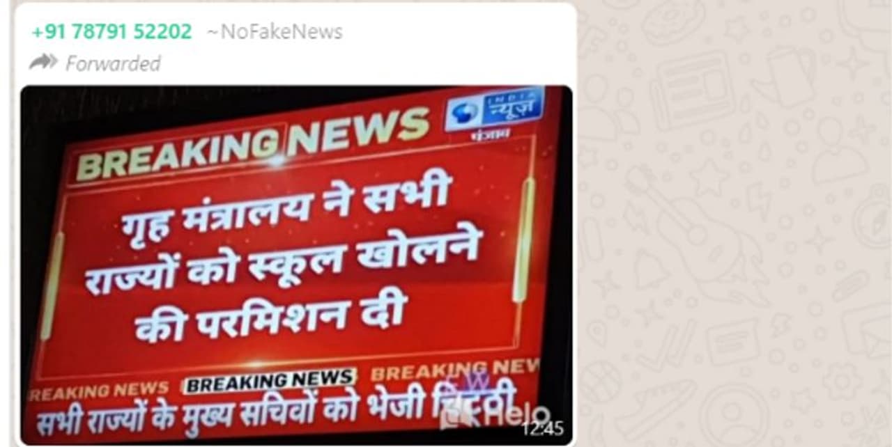 वॉट्सएप्प पर न्यूज चैनल की ब्रेकिंग के स्क्रीनशॉट के साथ एक मैसेज वायरल हो रहा है। इसके आधार पर दावा किया जा रहा है कि गृह मंत्रालय ने सभी राज्यों को 31 अगस्त से स्कूल खोलने की अनुमति दे दी है। दावा है कि गृह मंत्रालय ने सभी राज्यों के प्रमुख सचिवों को इस संबंध में पत्र भी लिखा है।