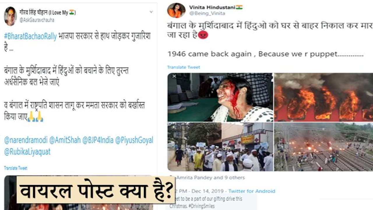 वायरल पोस्ट में एक महिला समेत दो घायल शख्स की तस्वीरों के साथ दावा किया गया कि, बंगाल में हिदुंओं को घर से बाहर निकालकर मारा जा रहा है, इसमें आग में जल रही ट्रेन समेत विशेष समुदाय के लोगों को उत्पात मचाते दिखाया जा रहा है। इसमें कई तस्वीरें शामिल है जैसे आग में जलती ट्रेन और रेलवे ट्रैक पर टायर फेंकते लोग। पोस्ट में दावा किया जा रहा है कि पश्चिम बंगाल में नागरिकता बिल के विरोध के चलते विशेष समुदाय के लोग हिंदुओं पर अत्याचार कर रहे हैं इसलिए एनआरसी जरूरी है। उपद्रवियों को बांग्लादेशी घुसपैठिए भी बताया जा रहा है।