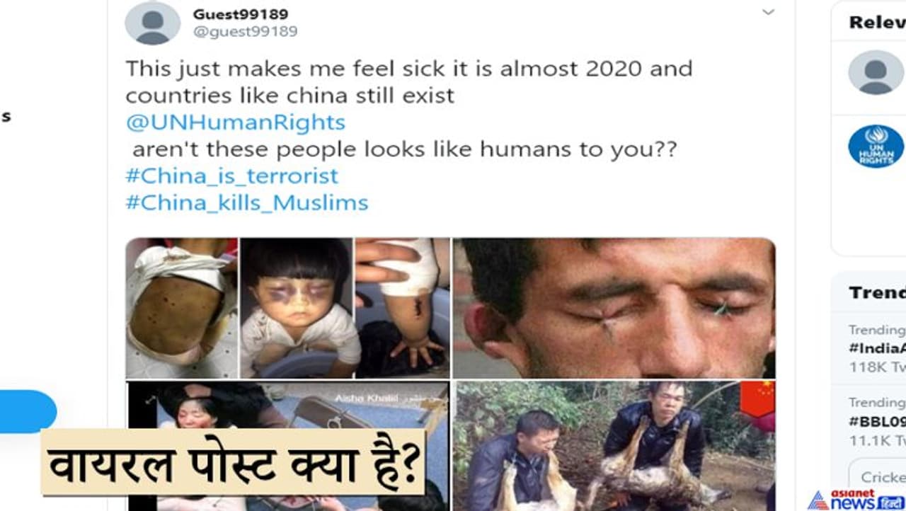 ट्विटर हैंडल पर ये तस्वीरें सामने आई हैं जिनमें एक शख्स के आंख और मुंह सिले हुए नजर आ रहे हैं। एक महिला के नाखून उखाड़े जा रहे हैं। फोटोज देख लोगों ने शरणार्थियों की चिंता पर इन्हें शेयर करना शुरू कर दिया। पोस्ट में लिखा गया कि, ये सभी तस्वीरें चाइना की हैं जहां लाखों उइगर मुस्लिम शरणार्थी हैं जिन्हें टॉर्चर किया जाता है ताकि वो चीनी सभ्यता को अपनाएं।