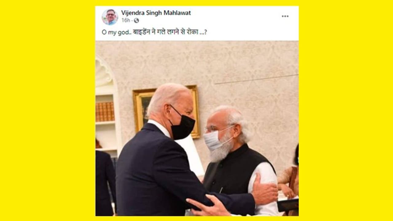 वायरल तस्वीर में दिख रहा है कि पीएम मोदी और जो बाइडेन मास्क लगाए हुए एक दूसरे के सामने खड़े हैं। जो बाइडेन ने पीएम मोदी के हाथ पर अपना हाथ रखा है। वहीं पीएम मोदी ने भी जो बाइडेन का हाथ पकड़ा है। दोनों नेताओं के चेहरे पर हल्की सी मुस्कान है। इसी तस्वीर के साथ यूजर्स ने लिखा है कि जो बाइडेन ने पीएम मोदी को गले लगने से रोक दिया।