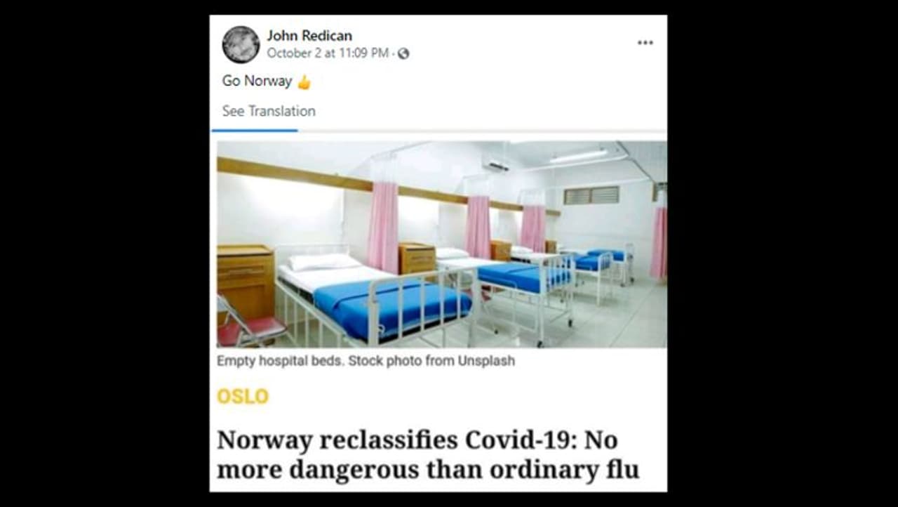 सोशल मीडिया पर वायरल क्लिप में बताया गया है कि नॉर्वे ने कोविड -19 को दोबारा क्लासिफाईड यानी वर्गीकृत किया है। इसके मुताबिक ये सामान्य फ्लू से अधिक खतरनाक नहीं है। कई लोग इस पोस्ट के साथ थम्सअप का साइन बनाकर कह रहे हैं गो नार्वे।