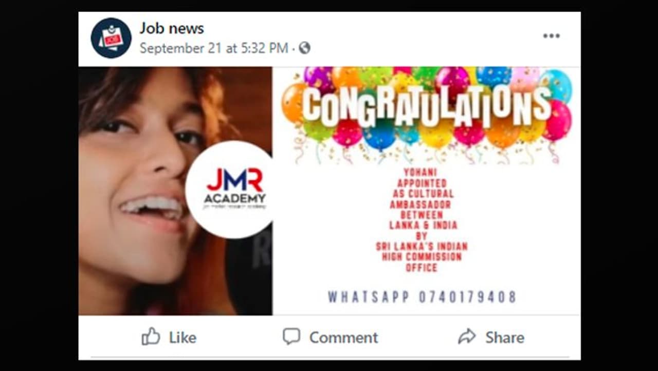 सोशल मीडिया पर वायरल मैसेज में बताया जा रहा है कि योहानी को कोलंबो हाईकमीशन में कल्चरल एंबेसडर नियुक्त किया गया है। वे भारत और श्रीलंका के बीच कल्चर को लेकर काम करेंगी। कुछ वेब पोर्टल्स ने भी ऐसा ही दावा किया है।