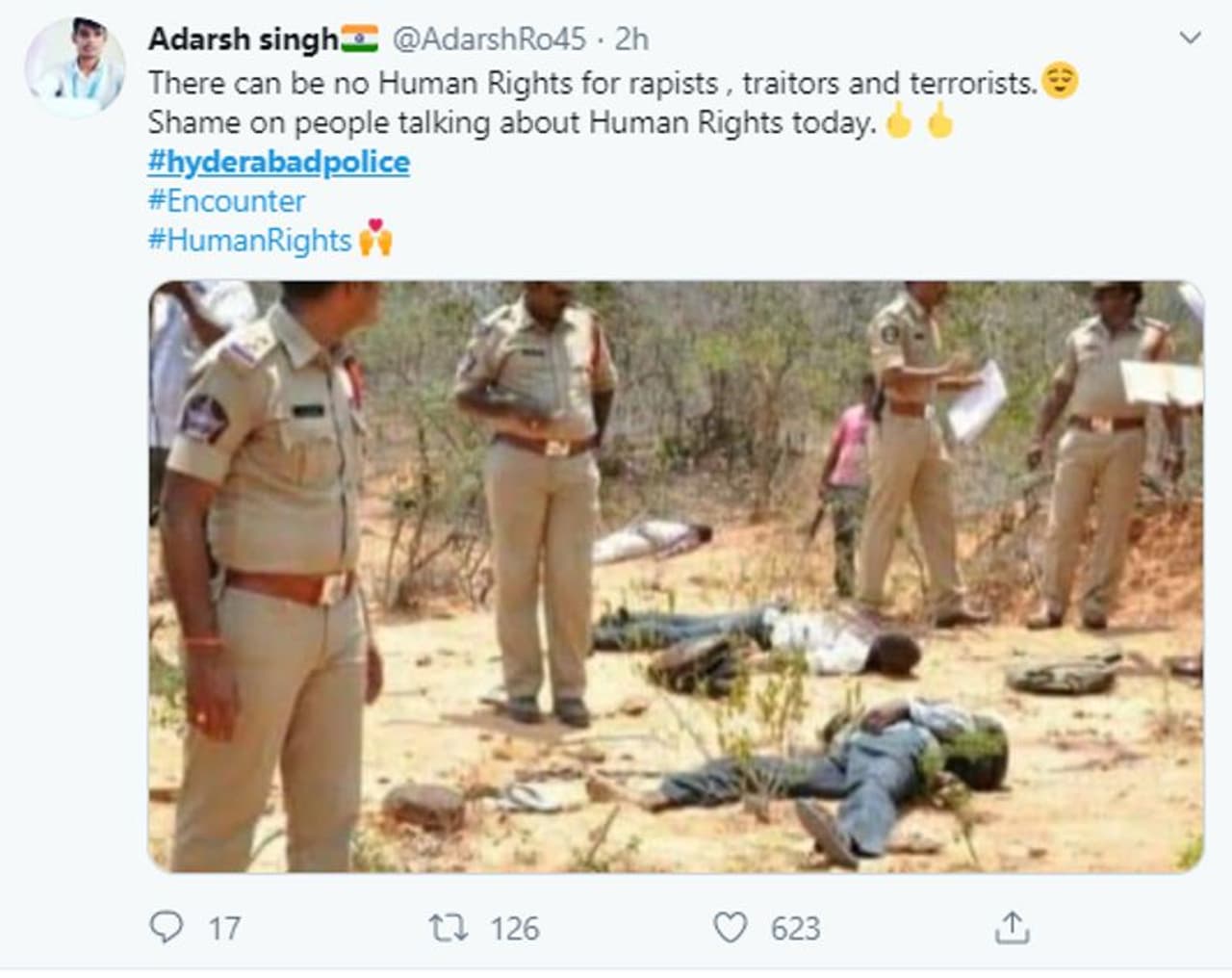 ट्विटर पर आदर्श सिंह नाम के एक शख्स ने तस्वीर शेयर करते हुए लिखा- आंतकवादियों और बलात्कारियों के लिए कोई हयूमन राइट्स नहीं होते तेलांगना पुलिस ने हैदराबाद केस के आरोपियों को ढेर कर दिया।