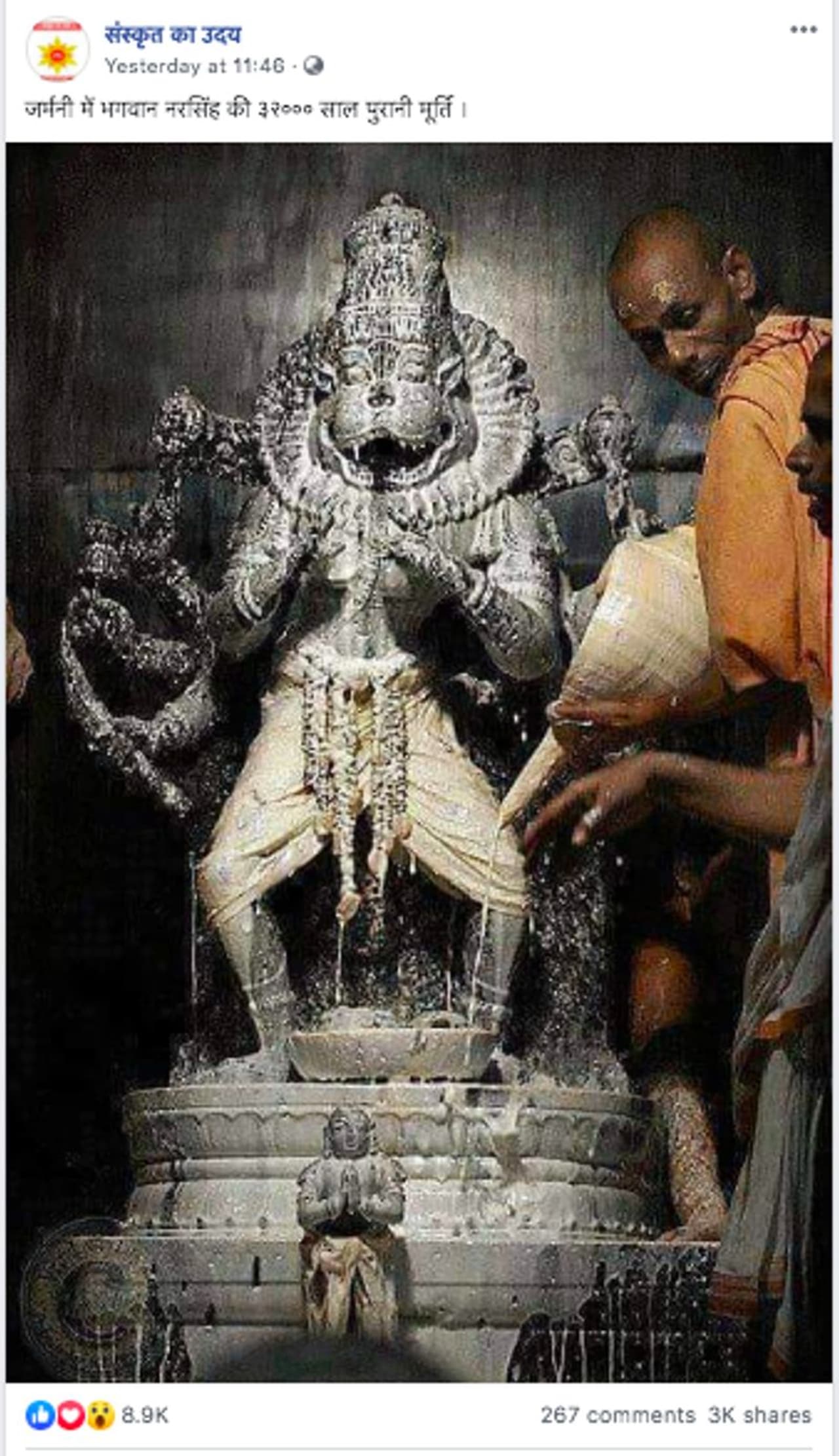 वायरल इमेज जुड़ा ये दावा कई सालों से ऑनलाइन घूम रहा है। साल 2012 में भी फेसबुक पर कन्नड़ भाषा में इस खबर से जुड़ी कई पोस्ट हैं जो दावा करते हैं कि जर्मनी में भगवान नरसिम्हा की 32,000 साल पुरानी मूर्ति पाई गई।"
