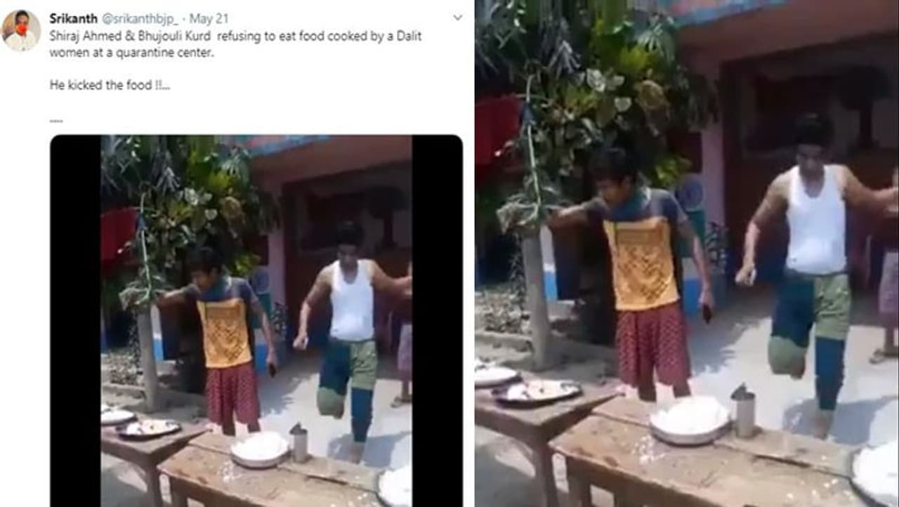नई दिल्ली . सोशल मीडिया पर एक वीडियो खूब वायरल हो रहा है। इसमें एक स्कूल में क्वारंटीन किए गए युवक द्वारा टेबल पर रखे भोजन को लात मारकर गिरा दिया जाता है। खाना बनाने वाली महिला को भला-बुरा कहते हुए टेबल पर लात मारकर उसे गिराया जाता है। 21 मई को एक ट्विटर यूजर श्रीकांत ने इस वीडियो को पोस्ट करते हुए लिखा कि “शिराज अहमद और भुजौली कुर्द ने दलित महिलाओं द्वारा एक क्वारंटाइन सेंटर में बनाए गए भोजन को खाने से इंकार करते हैं। यही नही दोनों भला-बुरा कहते हुए खाने को लात मारकर गिरा देते हैं। इस वीडियो को 1,800 से अधिक बार रीट्वीट किया गया और 5 लाख बार देखा गया। वायरल होने के बाद हमने इस वीडियो की जांच पड़ताल करके सच्चाई जानने की कोशिश की।