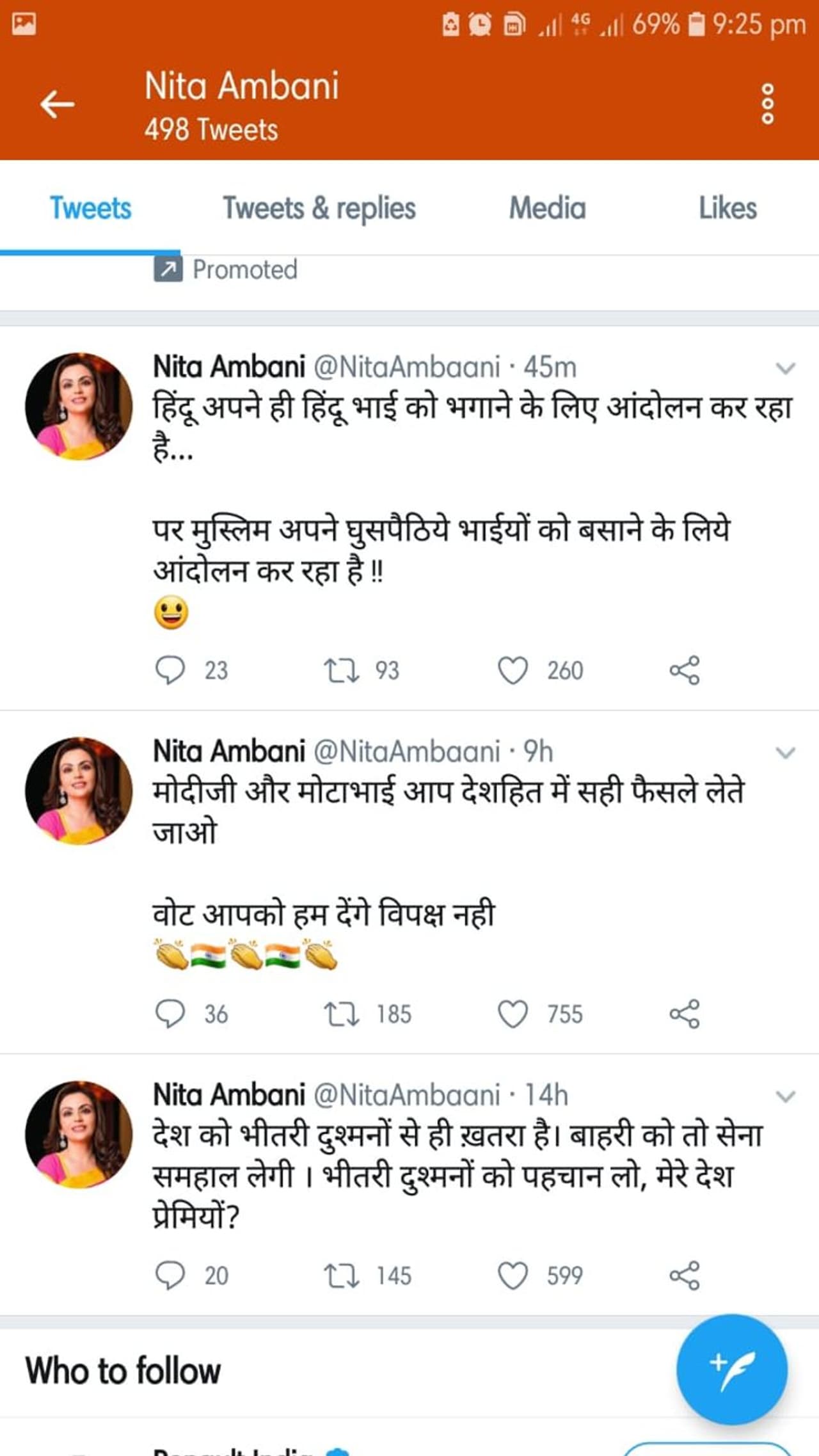 नीता अंबानी के नाम से भी कई ट्वीट्स सामने आए। इनमें एनआरसी और सीएए के पक्ष में लिखा गया था। वहीं प्रदर्शनों पर भी अजीब तरह की बातें हिंदी भी लिखी गईं। जिसके कारण अकाउंट पर शक हुआ।