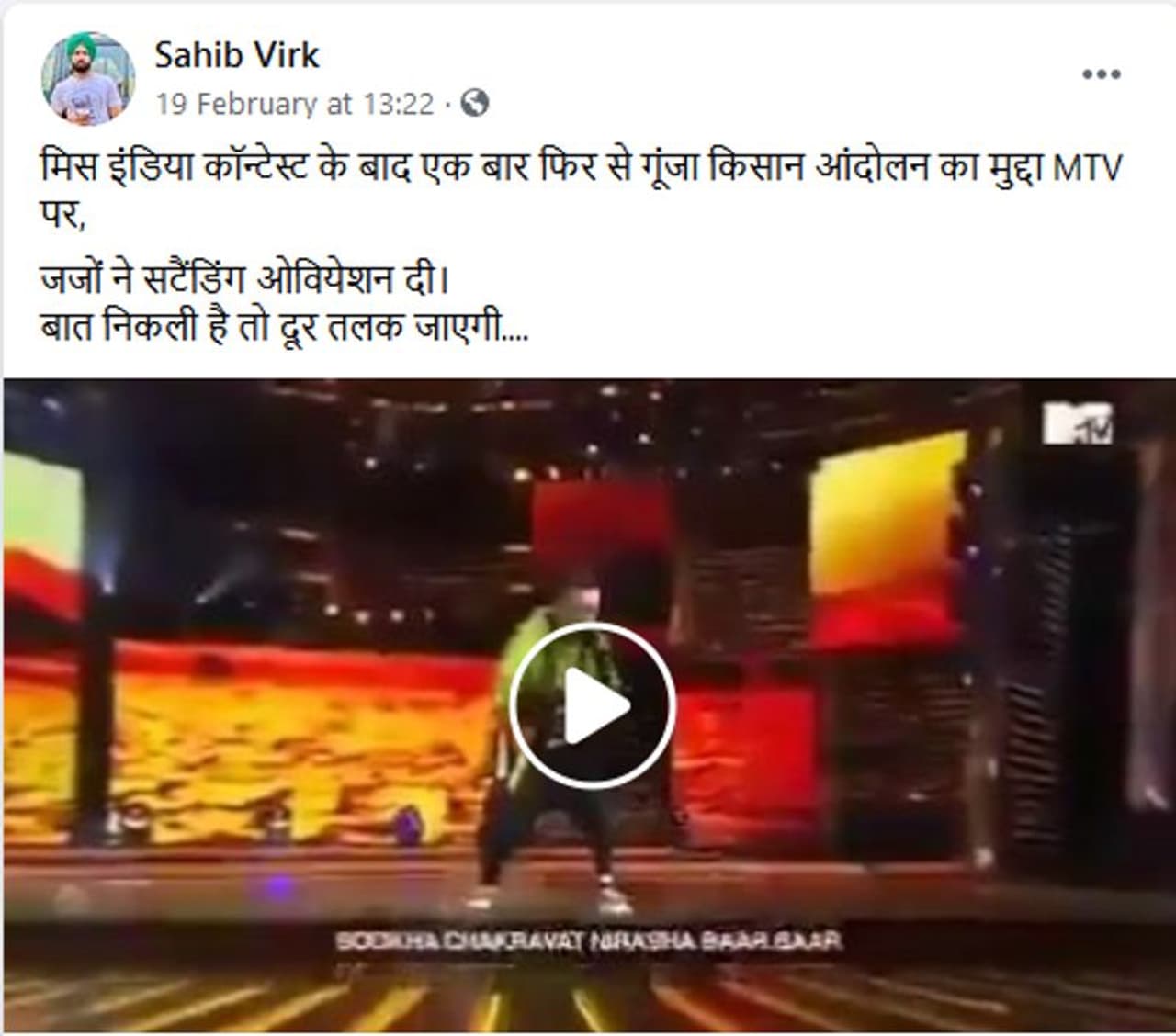 फेसबुक यूजर Sahib Virk ने पोस्ट शेयर करते हुए कैप्शन में लिखा: मिस इंडिया कंटेस्ट के बाद एक बार फिर से गूंजा किसान आंदोलन का मुद्दा MTV पर जजों ने स्टैंडिंग ओवियेशन दी। बात निकली है तो दूर तलक जाएगी।