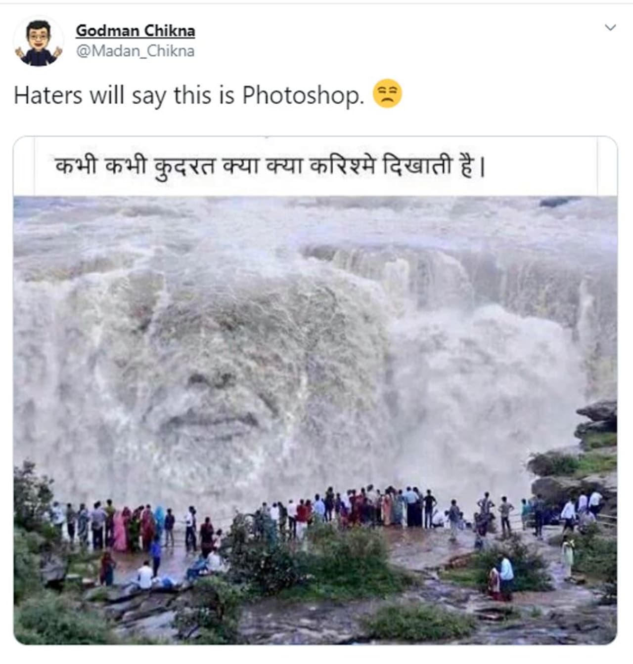 पीएम मोदी को सपोर्ट्स में से एक गॉडमैन ट्विटर हैंडल से ये फोटो शेयर की गई है जिसमें एक वॉटरफॉल को सैकड़ों लोग देख रहे हैं। इस तस्वीर पर किसी की भी नजर इसलिए ठहर जाए क्योंकि इस झरने के पानी में पीएम मोदी का अक्श नजर आ रहा है। पर क्या वाकई देश में ऐसा कोई झरना है भी?