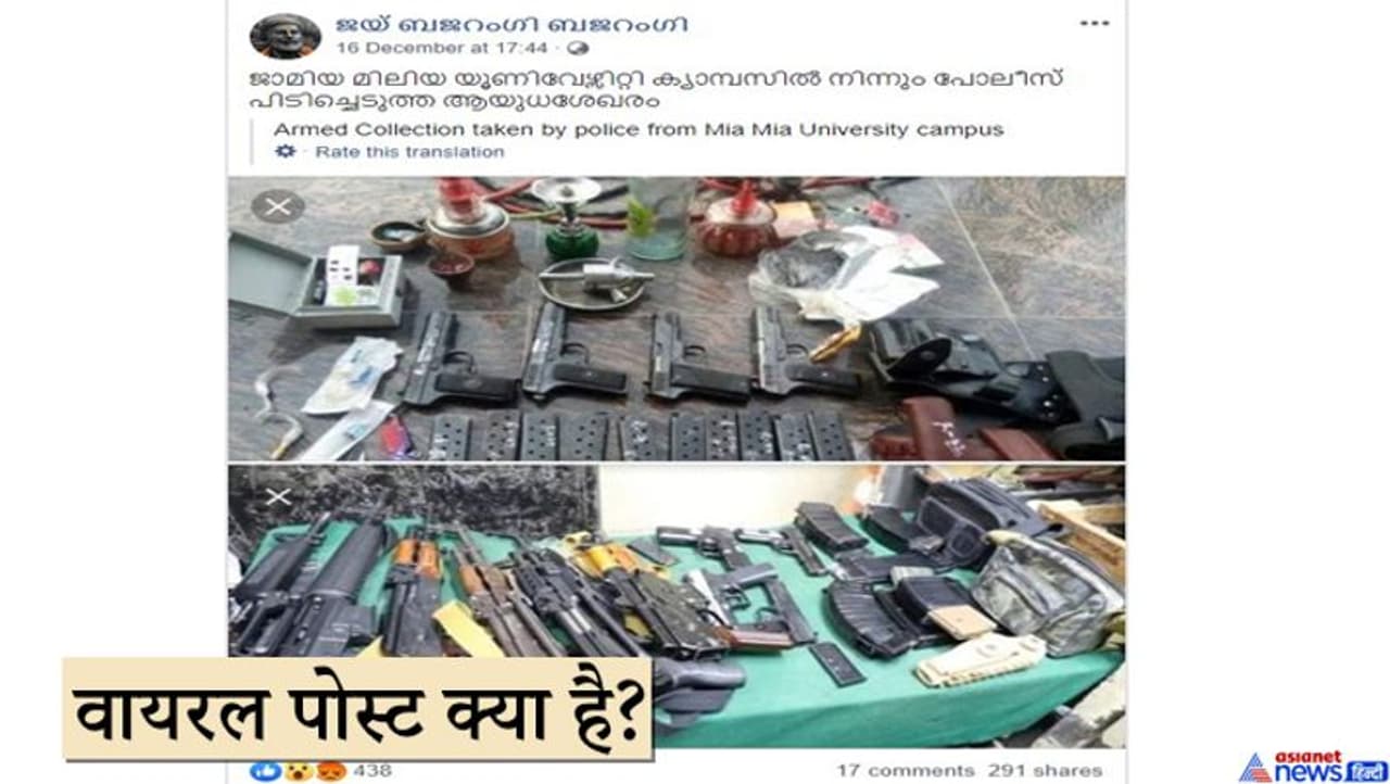 एक फेसबुक यूजर ने 16 दिसंबर को मलयालम भाषा में लिखा, 'ये जामिया मिल्लिया इस्लामिया परिसर में बरामद किए गए हथियार हैं। पीएफ हथियार और गोला-बारूद की ये फोटो देखते ही देखते सोशल मीडिया पर वायरल हो गई।