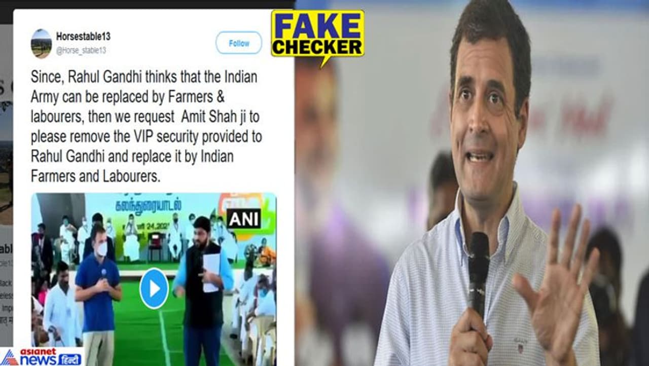 Horsestable13 नाम के ट्विटर हैंडल ने 25 सेकंड का ये वीडियो ट्वीट किया गया है। इस वीडियो में राहुल गांधी बोलते हैं- इस ट्वीट के साथ अंग्रेजी में लिखे टेक्स्ट की हिंदी कुछ यूं है, ‘जब राहुल गांधी सोचते हैं कि भारतीय सेना की बजाय किसान और मजदूर तैनात हो सकते हैं तो हम अमित शाह जी से निवेदन करते हैं कि कृपया राहुल गांधी की वीआईपी सुरक्षा हटा ली जाए और उसकी जगह भारतीय किसान और मजदूर तैनात कर दिए जाएं।’