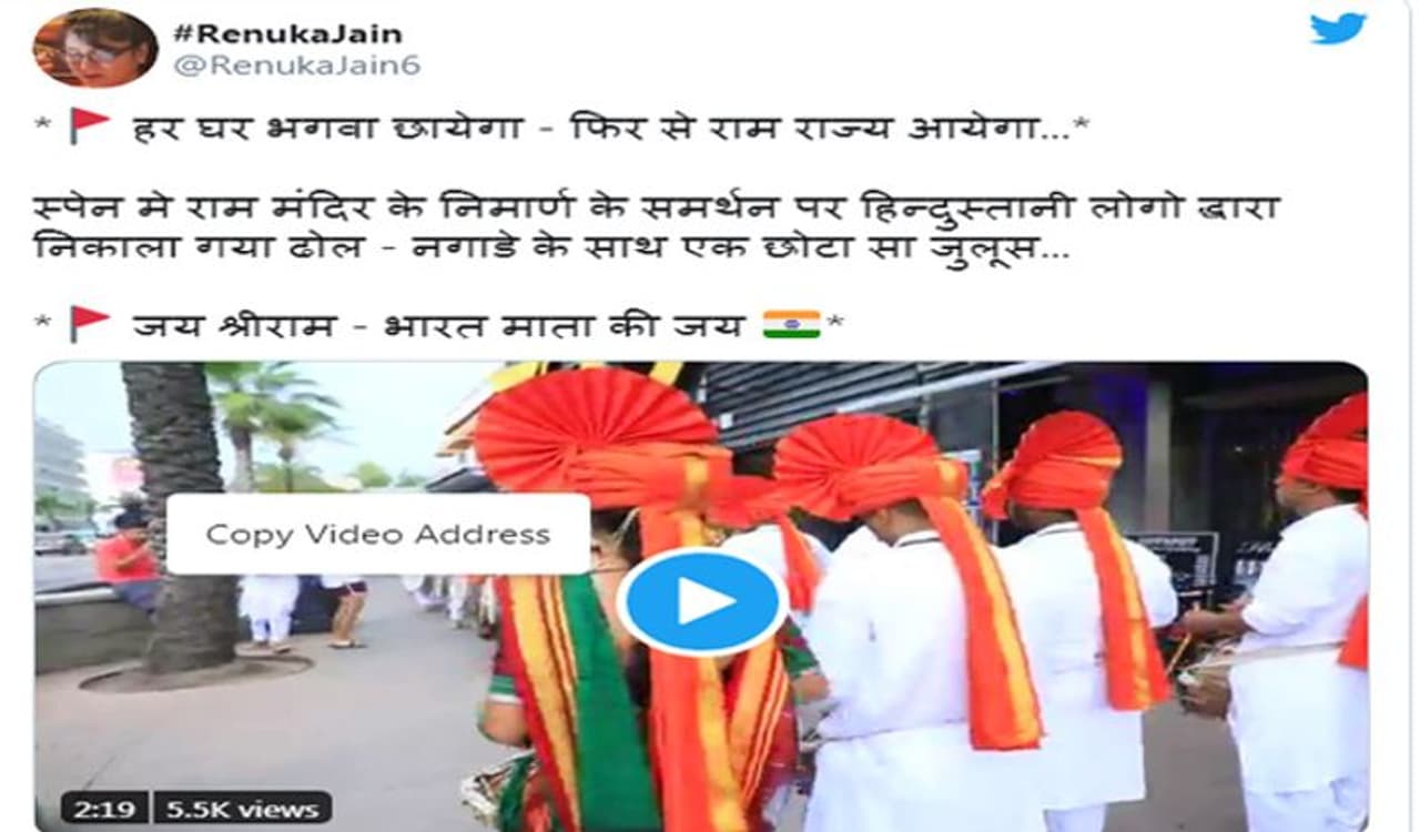 वीडियो के साथ कैप्शन दिया गया- 'स्पेन मे राम मंदिर के निमार्ण के समर्थन पर हिन्दुस्तानी लोगो द्धारा निकाला गया ढोल – नगाडे के साथ एक छोटा सा जुलूस…