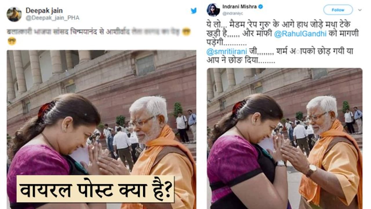 कुछ सोशल मीडिया यूज़र्स ने इस तस्वीर को शेयर करते हुए लिखा है, “बलात्कारी भाजपा सांसद चिन्मयानंद से आशीर्वाद लेती स्मृति ईरानी। पोस्ट में दावा किया जा रहा कि , केंद्रीय मंत्री ईरानी महिला सुरक्षा की आवाज तो बुलंद करती है लेकिन खुद एक रेप गुरू को आगे नतमस्तक हैं।