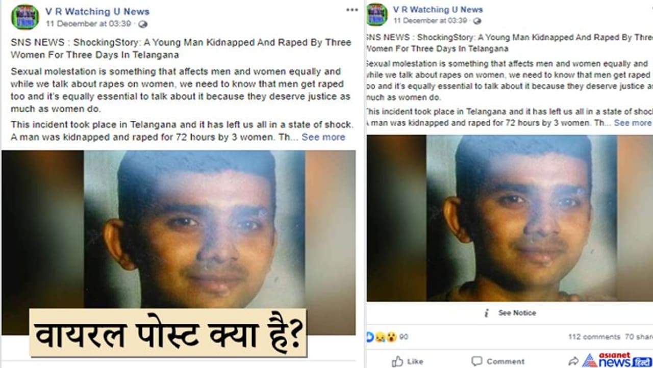 फेसबुक पेज 'वी आर वॉचिंग यू न्यूज' ने एक आदमी की एक लंबी कहानी के साथ तस्वीर पोस्ट की जिसमें घटना के बारे में बताया - एसएनएस समाचार चैनल ने एक हैरान कर देने वाली खबर छापी है, तेलंगाना में तीन दिन तक तीन महिलाओं द्वारा एक युवक का अपहरण और बलात्कार। महिलाओं ने उसे पहले जबरदस्ती वियाग्रा और एनर्जी ड्रिंक पिलाई फिर तीन दिन तक बंद रखकर उसके साथ दुष्कर्म किया, इसके बाद तेलंगाना में मेडक जिले के एक क्षेत्र में उसे फेंक दिया। पोस्ट के अंत में लोगों से सवाल पूछा कि, हम जानना चाहेंगे कि आप पुरुषों के यौन शोषण के बारे में क्या सोचते हैं?