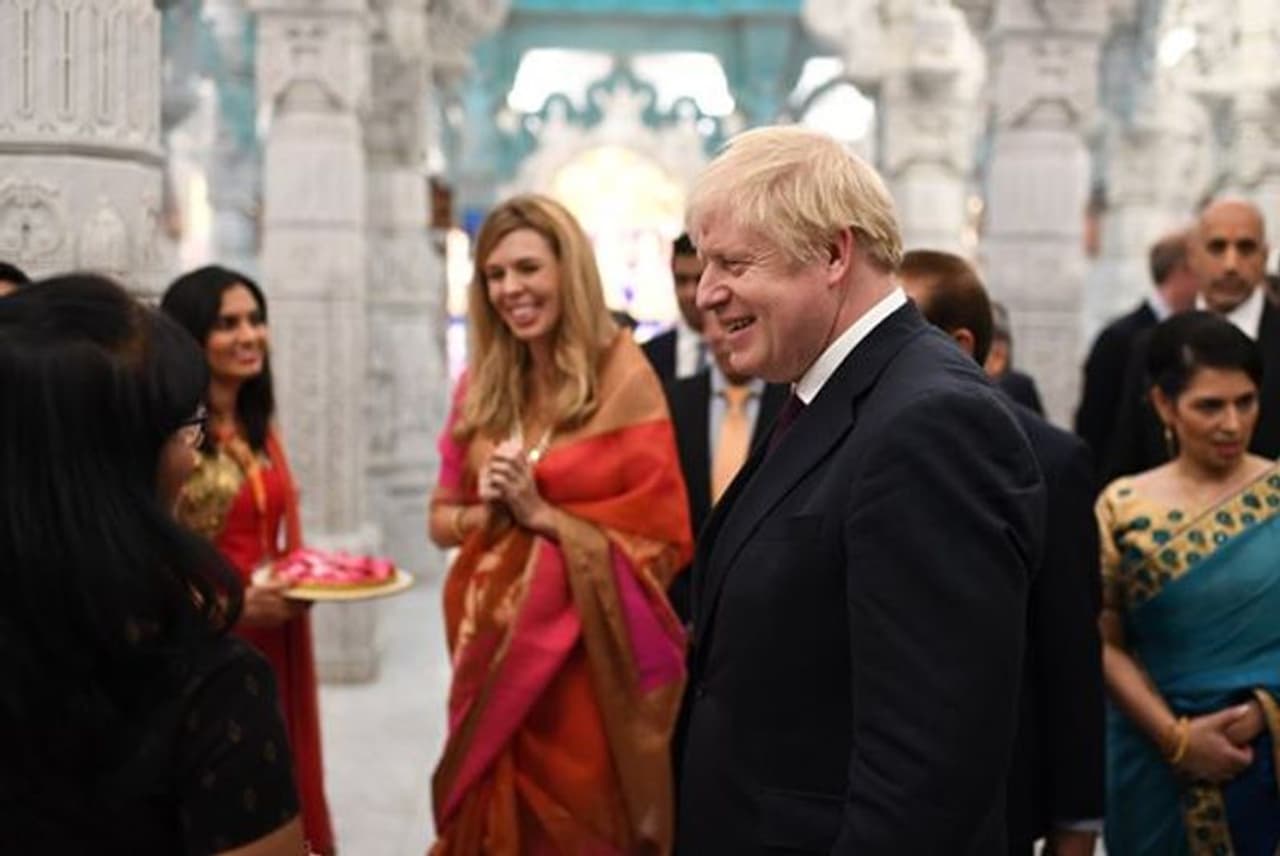 कंजरवेटिव पार्टी के फेसबुक पेज पर फोटो के साथ लिखे कैप्शन का हिंदी अनुवाद है: कल रात बोरिस जॉनसन ने लंदन में प्रीति पटेल के साथ नेसडेन के हिंदू मंदिर का दौरा किया।