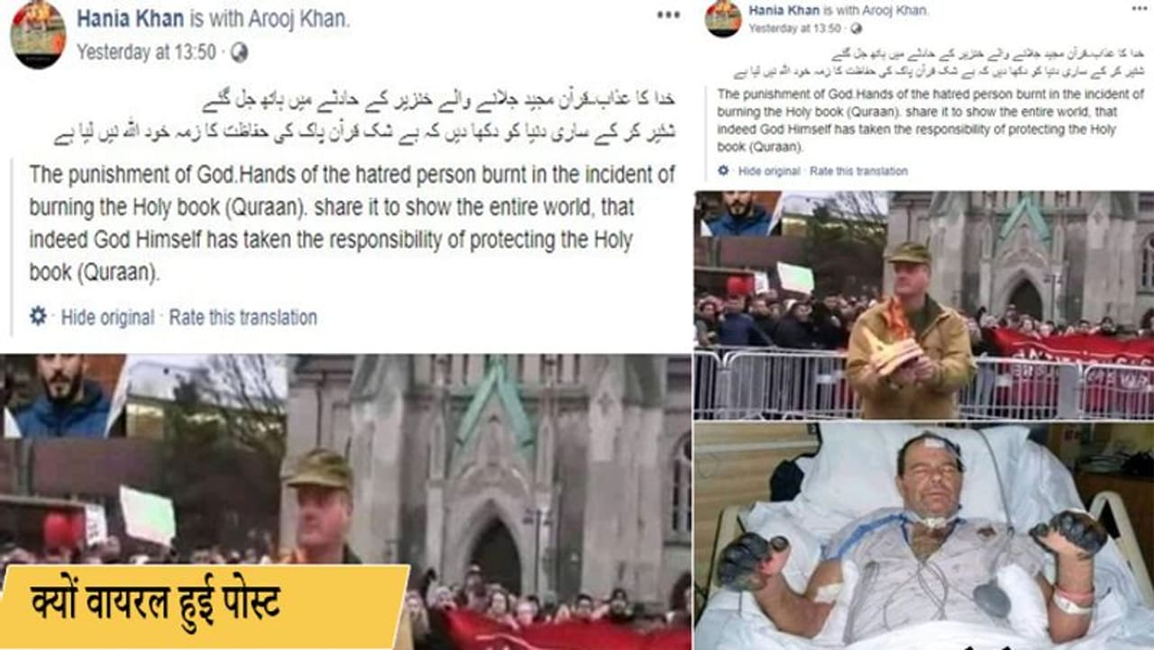 नई दिल्ली. पवित्र कुरान को जलाने से जुड़ी एक फोटो सोशल मीडिया पर वायरल है। दो फोटो के जरिए कहा जा रहा है कि एक शख्स ने पवित्र कुरआन-ए-शरीफ जलाने की कोशिश की और अल्लाह ने खुद उसे सजा दी। वायरल पोस्ट में मैसेज के साथ जो तस्वीरें हैं उसमें एक शख्स नजर आ रहा है। उसके दोनों हाथ भी जले हुए दिख रहे हैं। कई लोगों ने इस पोस्ट को शेयर किया है। हनिया खान नाम की एक फेसबुक यूजर ने वीडियो के साथ ये पोस्ट शेयर की है।