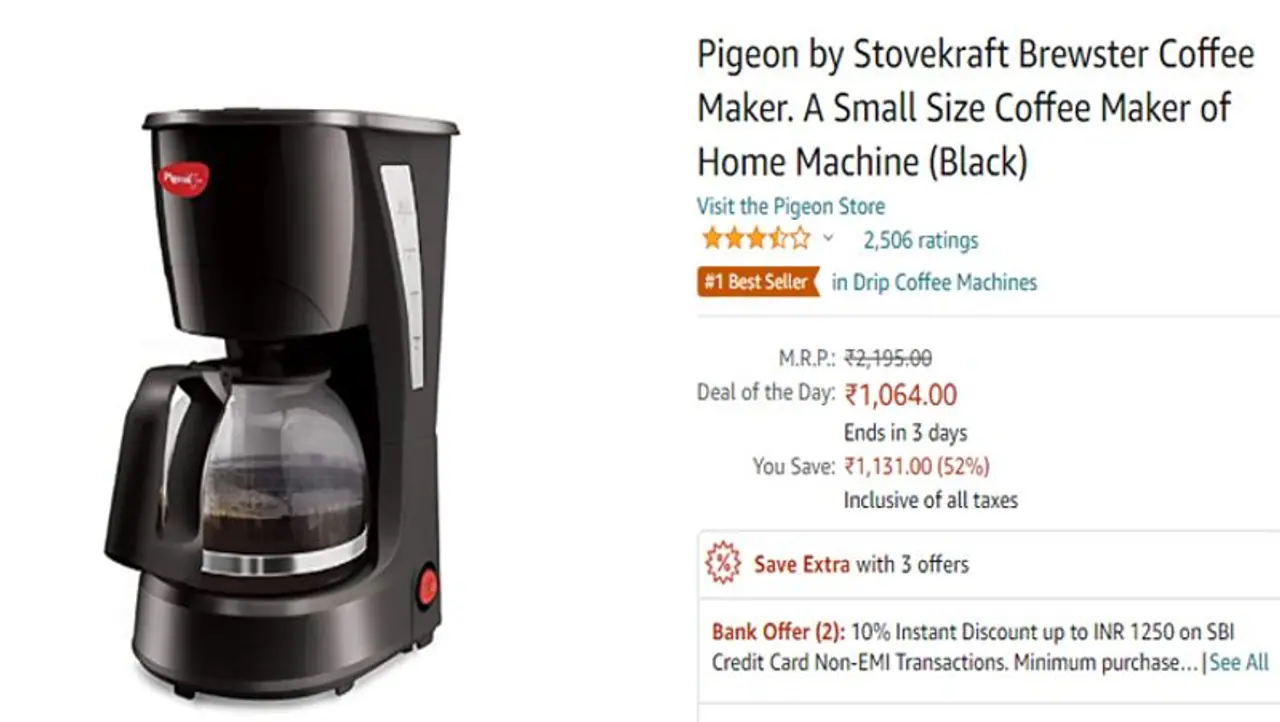 अगर आप अपने घर पर कैफे स्टाइल की कॉफी पीना चाहते हैं, तो पिजन कॉफी मेकर आपके लिए मदद कर सकता है। यह ब्रूइंग तकनीक और एक मेश फिल्टर के साथ आता है। इसकी कीमत ऑरिजन कीमत को 2,195 रुपये है, लेकिन अमेजन की सेल में अब यह 1,064 रुपये में उपलब्ध है।