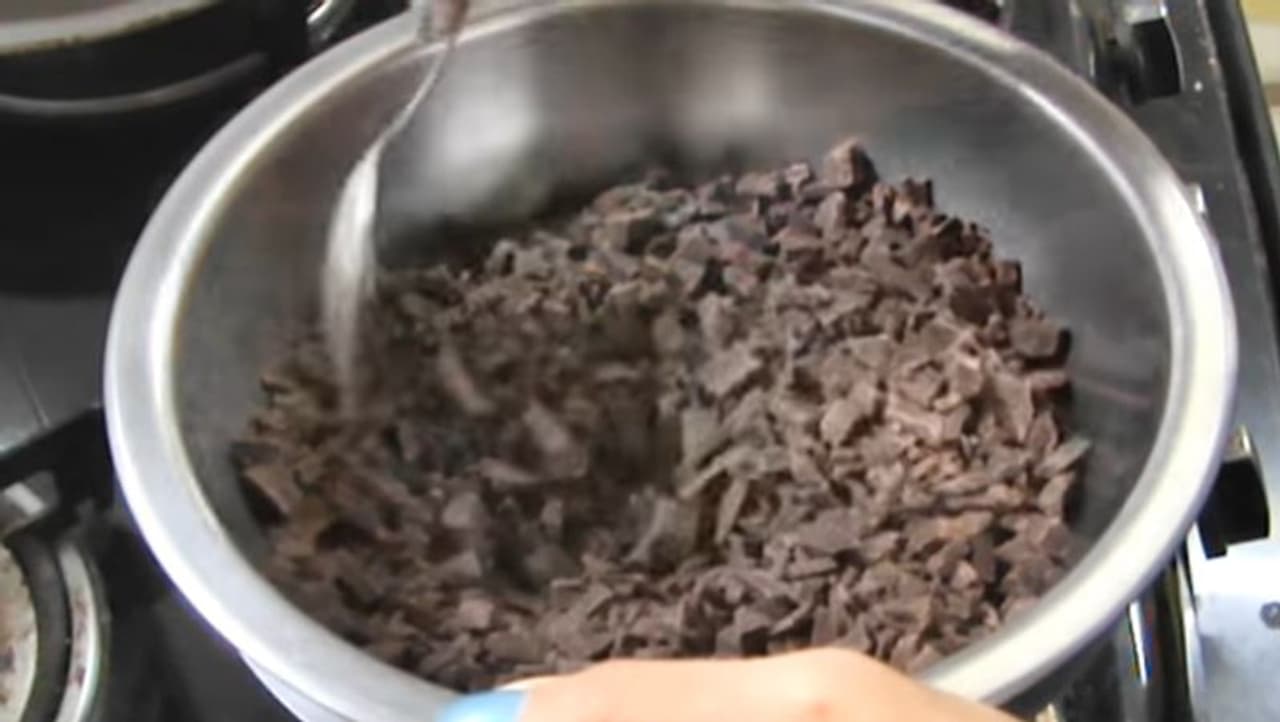 याद रहें की कटोरी में जरा सा भी पानी नहीं जाए। अब सॉस पैन से कटोरी निकालें और चॉकलेट को तब तक हिलाएं जब तक कि वह पूरी तरह से पिघल न जाए।