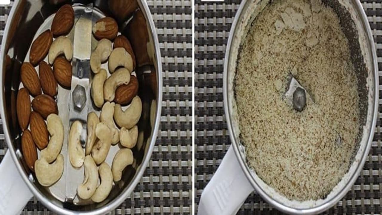 ड्राई फ्रूट्स वाले शुगर फ्री मोदक बनाने के लिए सबसे पहले एक बादाम और काजू को मिक्सी के जार में डालिए और इसे दरदरे पाउडर में पीस लें।