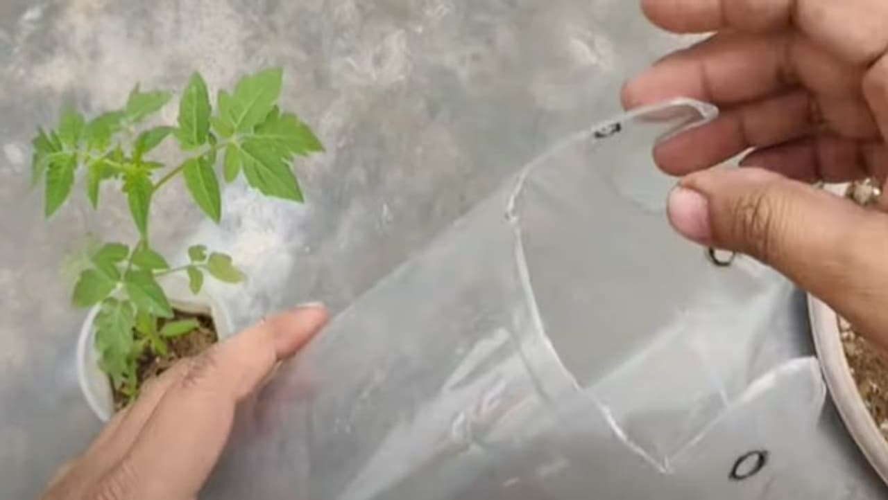 अब टमाटर का एक 20 से 25 दिन का पौधा लें और इस कपडे में डाल लें और कपड़े का कटा हुआ हिस्सा सिल दें या पिन लगा दें। फिर इस पौधे को बोतल में पीछे से डालें और बोतल के मुंह से पौधा कपड़े तक बाहर निकाल लें। ध्यान रहें कि पौधे की जड़े बोतल से बाहर न निकलें।