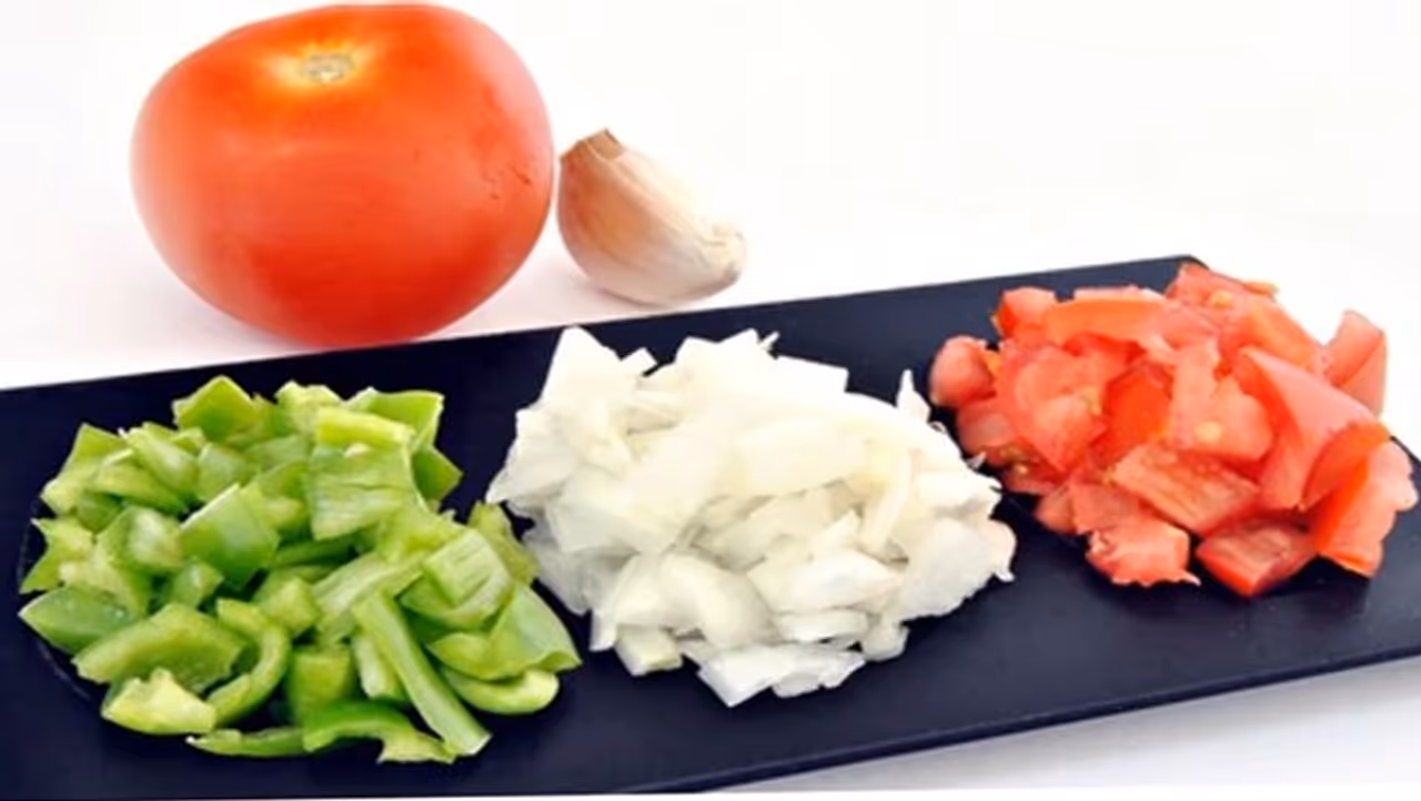 आलू दो प्याजा बनाने के लिए 1-1 प्याज, शिमला मिर्च और टमाटर को बड़े-बड़े आकार में काट लें और एक पैन में थोड़ा सा तेल गरम करके इसमें कटे हुए प्याज-टमाटर को भून लें और एक तरफ रख दें।