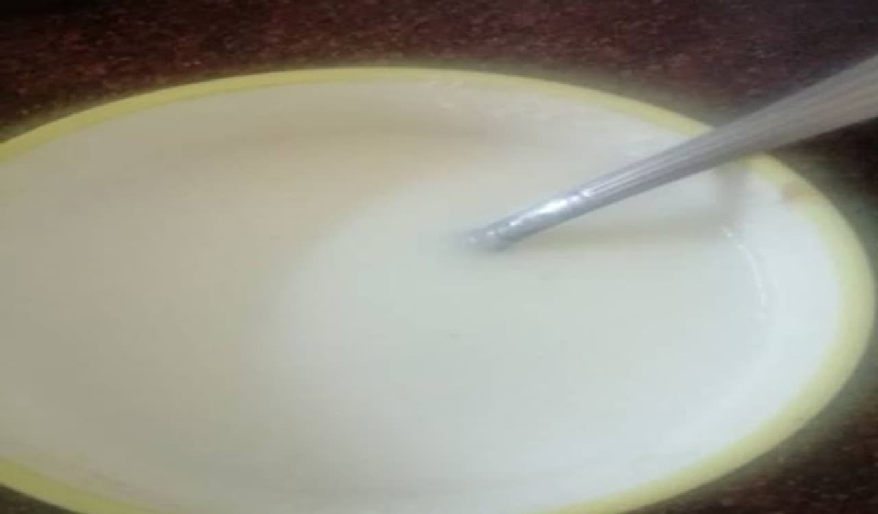 सबसे पहले खेरू बनाने के लिए दही को अच्छे से फेंट लें। इसे अच्छे से फेंटना है। आप चाहें तो बीटर से उसे फेंट ले।