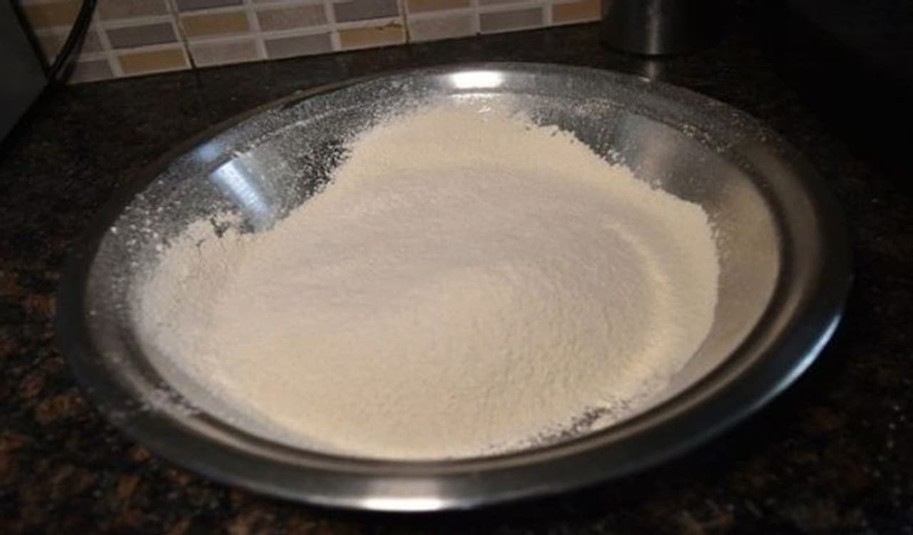 सबसे पहल एक बड़ा परात लीजिये। अब इसमें सूखा आटा डालिये। बर्तन इतना बड़ा होना चाहिए कि आपको आटा मिलाने में दिक्कत ना आए।