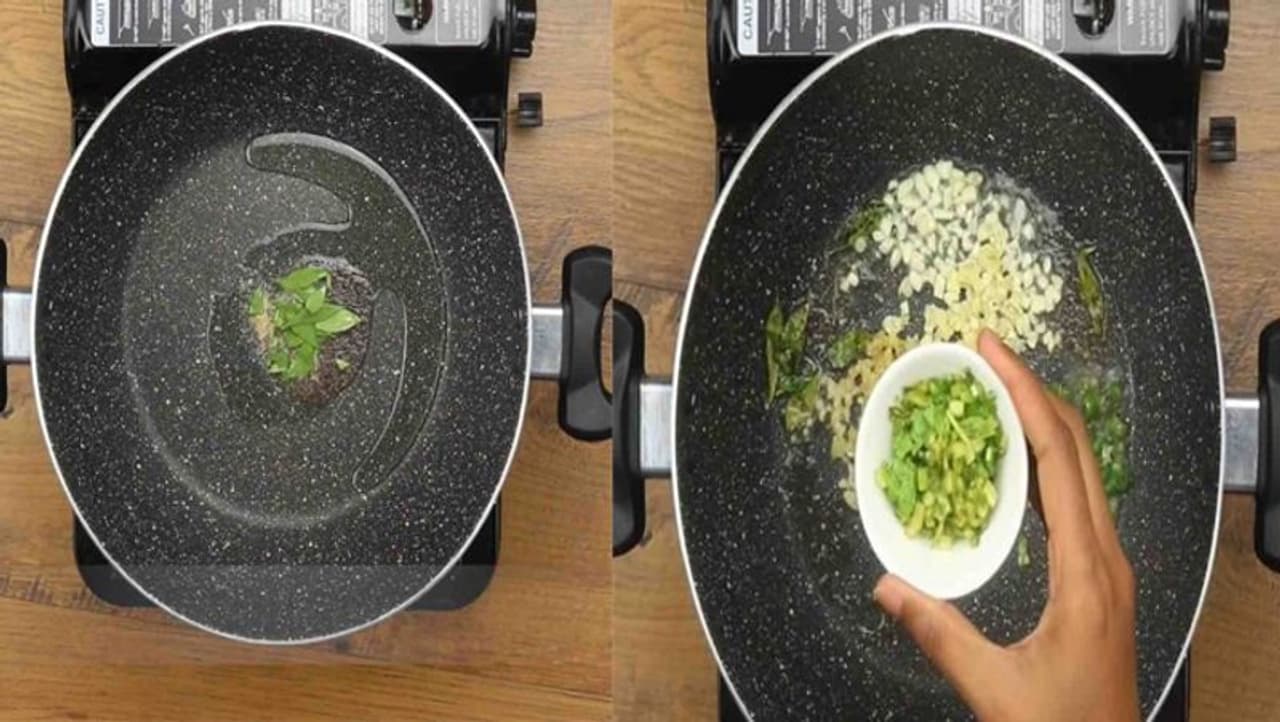 वड़ा बनाने के लिये सबसे पहले आलू को उबाल कर मासला तैयार कर लें। इसके लिए आप एक पैन में 1 टेबल स्पून तेल गर्म करें और राई, हींग और करी पत्ते डालें। राई चटकने के बाद अदरक, लहसुन और हरी मिर्च का पेस्ट डाल दें 2 मिनट तक भुनें।