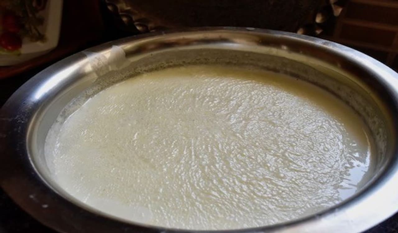 अब इस पानी को कटोरे में छान लें और उसे फ्रिज में रख दें। तीन से चार घंटे बाद कटोरे को बाहर निकालें और फिर ऊपर जमे घी को चाक़ू से काटते हुए बाहर निकाल लें।