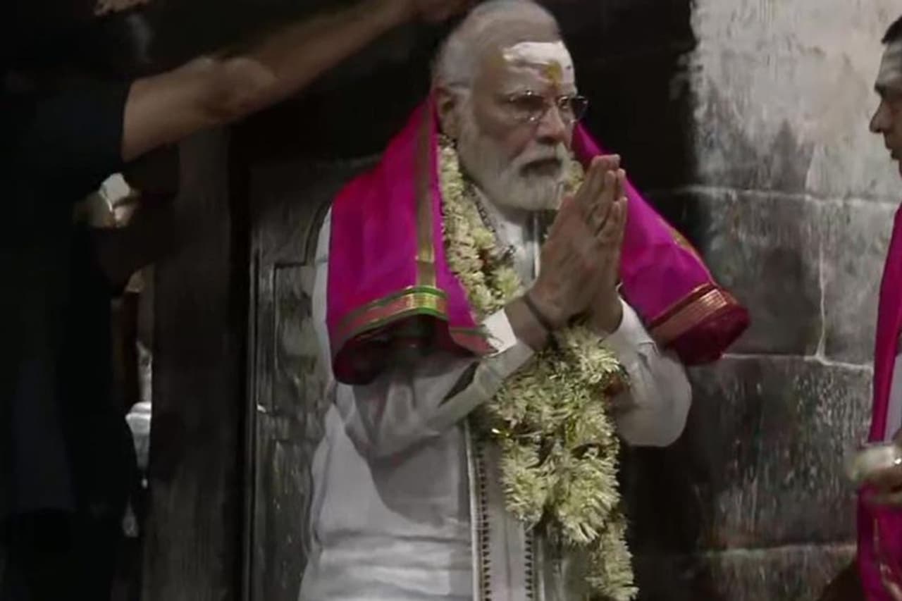 पीएम मोदी ने गर्भगृह में बैठकर पूजा की। पीएम मोदी के मस्तक पर तिलक लगाते हुए मंदिर के पुजारी। पीएम मोदी के पूजा करने के 4 घंटे पहले आम लोगों के लिए मंदिर बंद कर दिया गया था।
